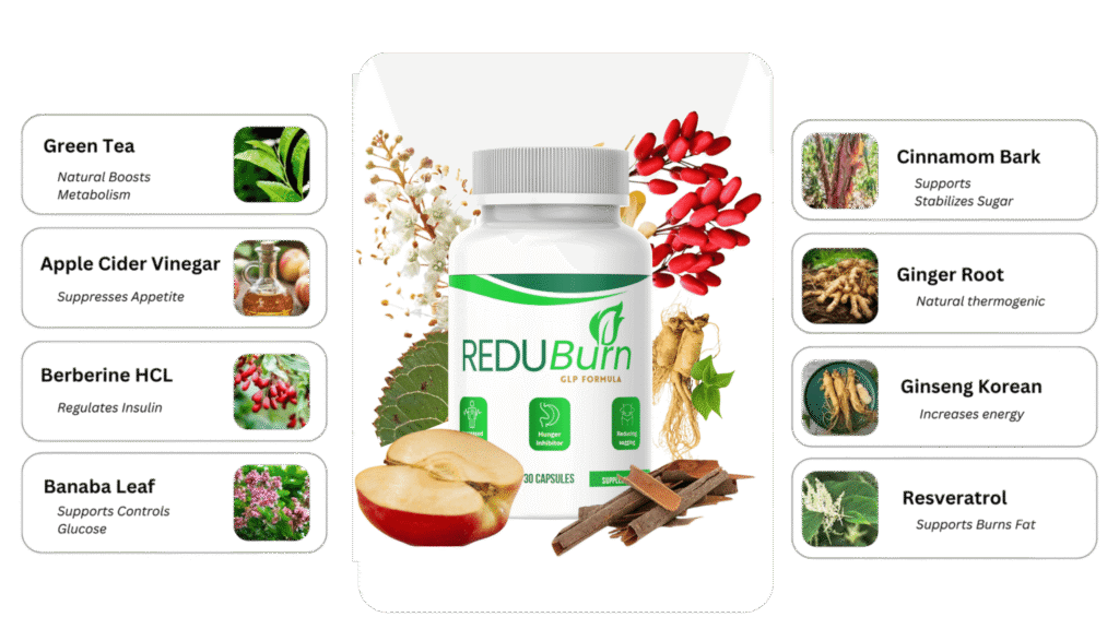 ReduBurn’s formulation harnesses the power of natural ingredients, each uniquely contributing to support weight loss, boost metabolism, and promote overall well-being. Here’s a closer look at the primary components and their benefits:
